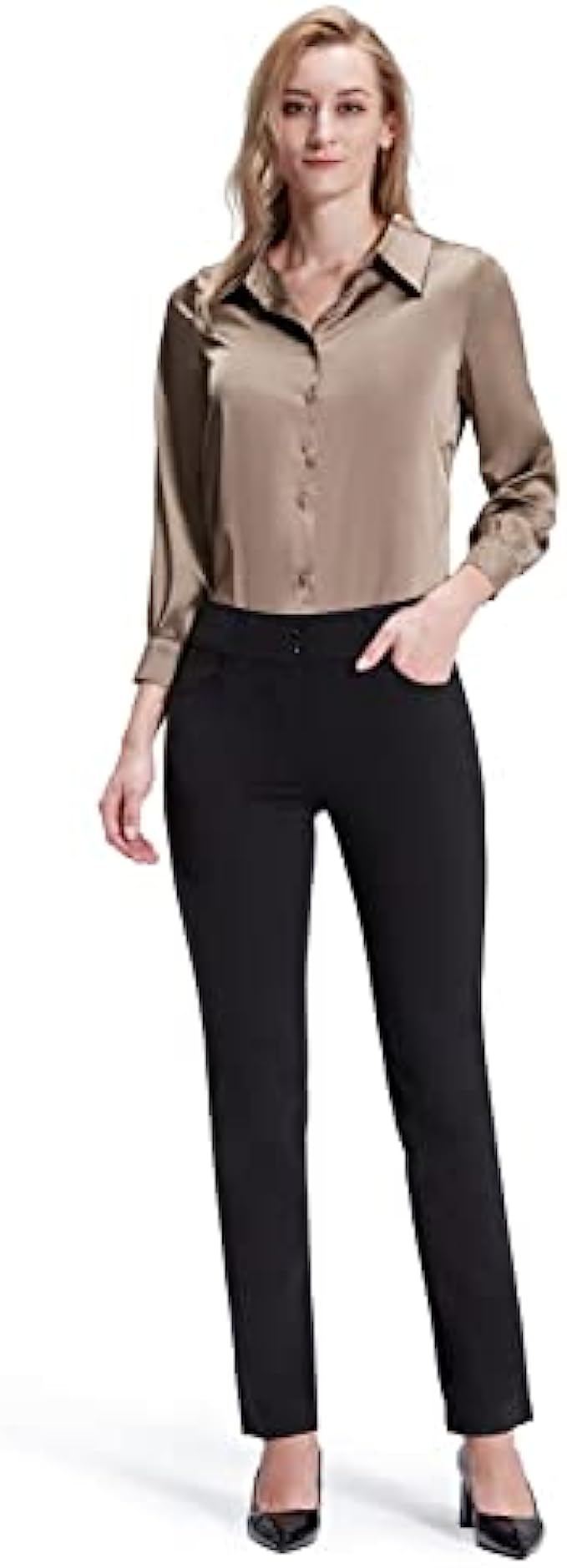 Bamans Dress Pants for Women Straight Leg Stretchy Work Pants Pull-On Business Casual with Pockets