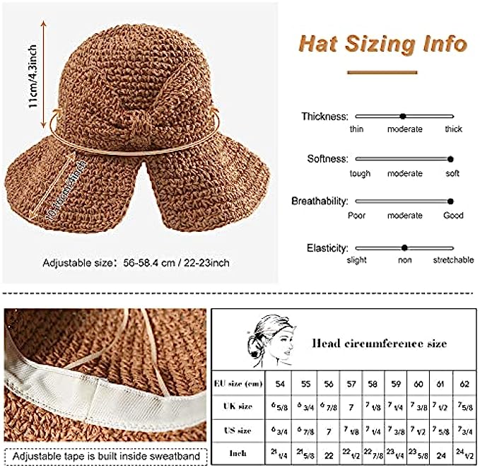 • 【ADJUSTABLE STRAW SUN HAT】- Features with wicking sweat band to keep you cool and comfortable, prevent the sweat dripping in your eyes.Ribbon inside the sun hat can be adjusted for different head size,from small head size to large head size around 22.05-22.83 inches.
