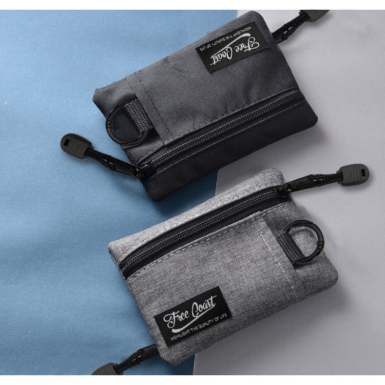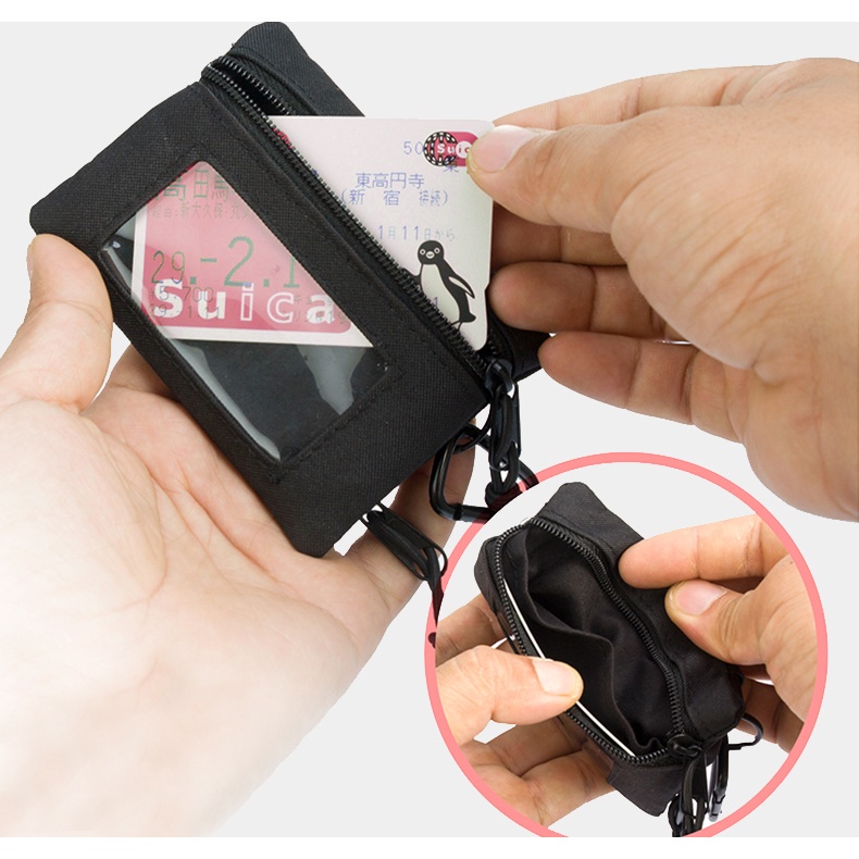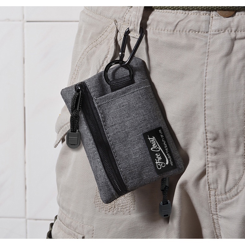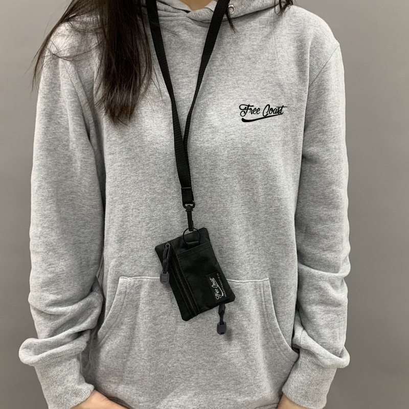 Comes with free carabiner and lanyard. Quality fits its price, great as my market wallet. Coins cards and notes can fit easily. Fast delivery too.