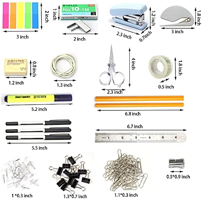 ALL IN ONE OFFICE KIT: you will find all the common office supplies from this little box, includs Binder Clips*12, Sharpener*1, Paper Clip*80, Stapler*1, Staples*1000, Rubber Band*12, Eraser*1, Clear Push Pin*18, Letter Opener*1, Page Marker*5, Steel Ruler*1, Pencil*2, Highlighter*1, Black Pens*3, Steel Scissor*1, Clear Tape*1,Clear Pencil Box* 1