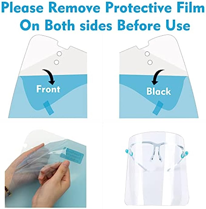 First use please tear off the films before use, there are 2 protective films on the safety face shield anti fog, one layer inside and one layer outside.High light transmittance after tearing off the protective film on both sides of the face shield glasses.