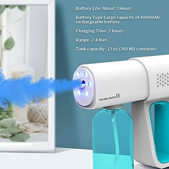 【Handheld Wireless Fogger】You can easily clean full rooms in under 5 minutes. More effective than manual hand wiping, pump spraying or mopping. The spraying range is about 2-4 feet. Nano sprayer gun can be sprayed directly on the surface of the human body, fabrics, home appliances and other objects.