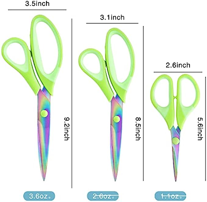 Titanium Scissors, Sharp Blades Shears, Rubber Soft Grip Handle, Multipurpose Scissors Set Great for Crafts, Sewing, Arts, Office, School and Home Supplies, 1 Set of 3 Pack, Green