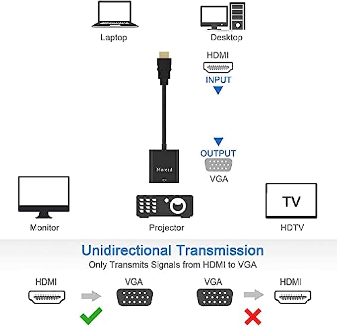 • COMPACT DESIGN - The compact-designed portable Moread HDMI to VGA adapter connects a computer, desktop, laptop, or other devices with HDMI port to a monitor, projector, HDTV, or other devices with VGA port; Tuck this lightweight gadget into your bag or pocket to do a business presentation with your laptop and projector, or extend your desktop screen to a monitor or TV; A VGA cable is required (sold separately)