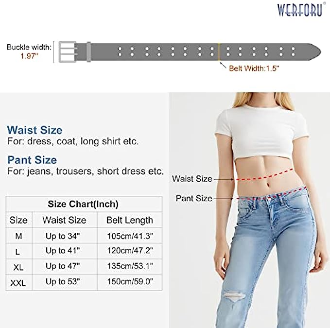 • ?Size for Leather Belt: Double grommets cover the whole strap is quite adjustable for different waist sizes. M fit waist size below 34".L fit waist size below 41".XL fit waist size below 47".2XL fit waist size below 53". This lady belt covered with holes is 1.5" wide that fit most pant loop. Because the grommets go all the way around the belt, you can continue to wear the belt even if you lose/gain weight.